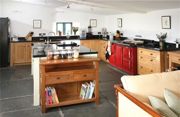 厨房/早餐室配有30安培的储藏室、4个AGA烤箱和带花岗岩顶部的实木屋,由Ashgrove Kitchens厨房制作。中央岛设有洗碗机、电动AGA模块和水槽。这间大房间有充足的空间,可容纳餐桌和起居区,与屋内大多数房间一样,享有山谷的美景。