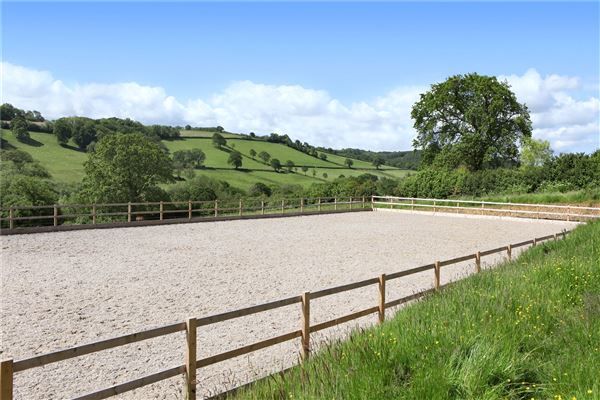 在通往围场的路上,有一座小的废弃土木小屋,在获得必要规划同意后,该小屋将适合改建。除此之外,还有马丁·柯林斯(Martin Collins)的石英砂和氯普夫(clopf)纤维表面的55米x25米Arena体育场,现有业主已经安装了它。然后,铁轨通往围场,田地和池塘就在后面。农场内的其他谷仓和外部建筑包括牛棚、煎草谷仓和干草谷仓。还有一辆克莱登五马步行车,可以谈判。Golland Farm农场周围的田地和围场延伸至约49英亩,这意味着这座房子完全被自己的土地围起来。